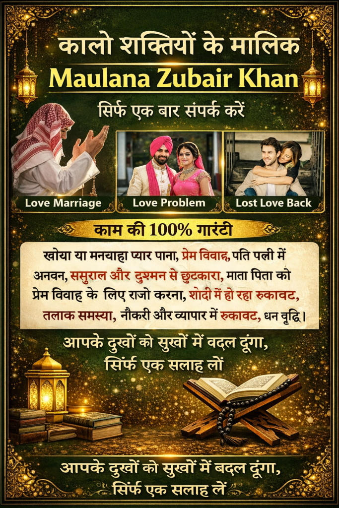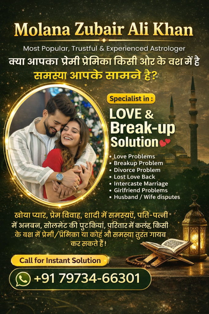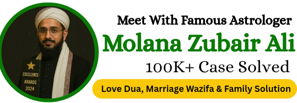Molana Zubair Ali Khan ek trusted aur experienced astrologer hain jinke paas 20+ years ka experience hai. Love marriage, relationship, family aur life problems ke liye unke solutions accurate aur result-oriented hote hain. Unhone hazaaron logon ki life me positive change laaya hai apni astrology aur spiritual guidance se. Unko 2024 me “Best Astrologer in India” award mila hai, aur apne career ke dauran ab tak 20+ awards jeet chuke hain. Unki honest working style aur client satisfaction hi unki sabse badi pehchaan hai.